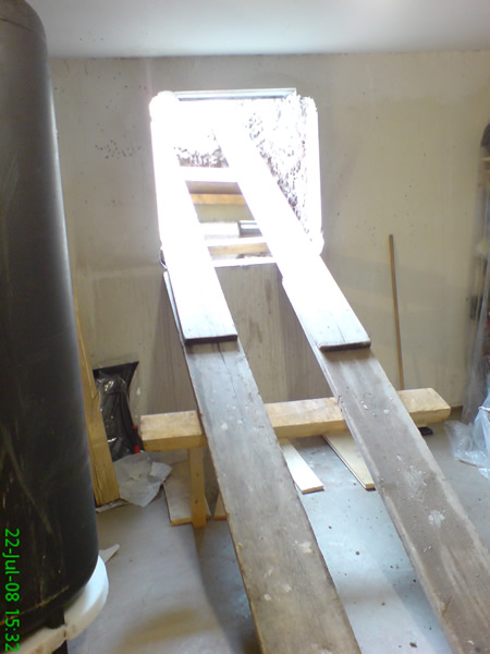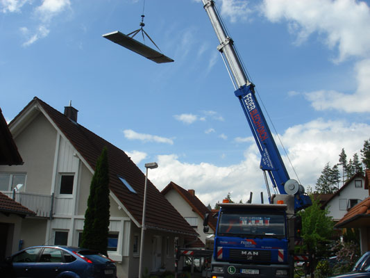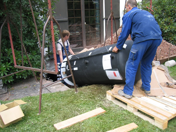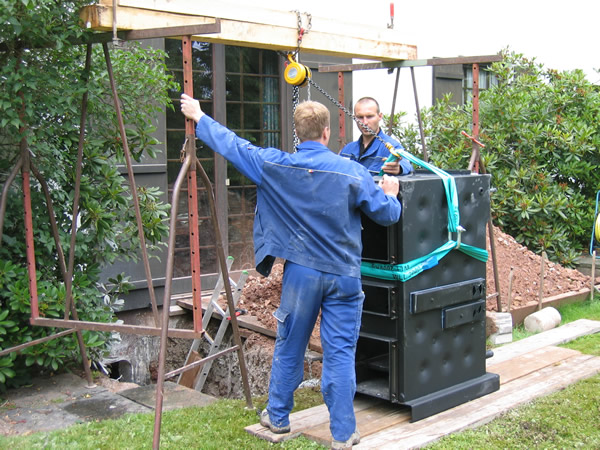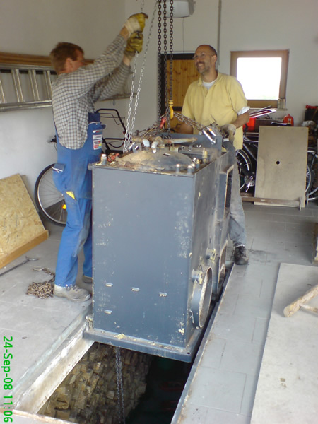 In diesem Fall war es unmöglich, die Heiztechnik über die Holztreppe in den Keller zu schaffen. Hierfür wurde ein Ausschnitt in die Betonaußenwand gesägt. Somit konnte mittels Rutsche der Holzkessel und die Speicher eingebracht werden. Anschließend wurde ein Lichtschacht und ein Fenster montiert. Somit kann auch das Brennholz direkt durchs Fenster in den Keller gebracht werden. Fazit: Es gibt immer eine Lösung!