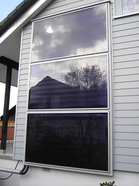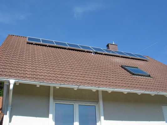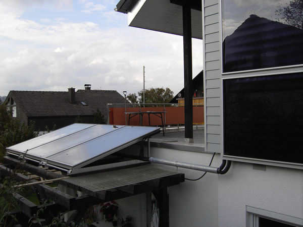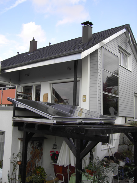 Heizungsunterstützende Schüco Solaranlage mit einer Gesamtkollektorfläche von 16,2m².Die Hälfte der Anlage wurde in die Fassade integriert (90°). Die andere Hälfte auf der überdachten Terasse (25°). Es arbeiten, je nach Sonneneinstrahlung beide oder nur ein Kollektorfeld. Die Anlage läuft mit einem 750l Solvis Gas Pur mit 20Kw. Die Trinkwasserbereitung erfolgt bei Solvis immer über eine Frischwasserstation im Durchlaufprinzip. Das Trinkwasser wird erst im Moment des Verbrauchs erwärmt. Somit geht keine Energie für eine „unnötige“ Wassererwärmung verloren. Ein weiterer großer Vorteil ist die Hygiene. Das Wasser ist immer frisch.